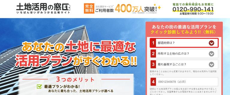 | 土地活用の窓口 | セカイエ株式会社 | - | - | 400万人以上 (不動産売却査定も含む) | 全国 |