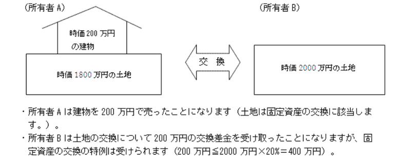 「時価1,800万円の土地+時価200万円」の建物と「時価2,000万円の土地」を交換した場合、前者は建物を200万円で売ったことになり、土地が固定資産税の交換に該当することになります。