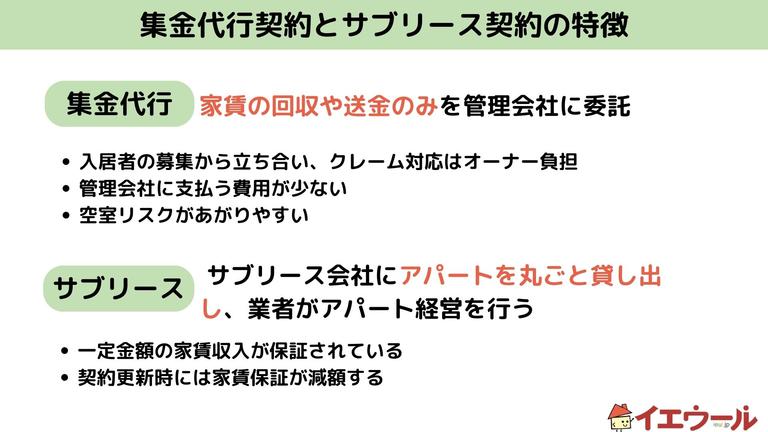 物件の所有者はオーナーのままで変わりませんが、実際にアパートの経営や管理を行うのが、管理会社になるという点は大きな特徴です。部分的なサポートを行う集金代行契約とは違い、アパート経営における包括的なサポートを受けられるものが、サブリース契約と考えましょう。