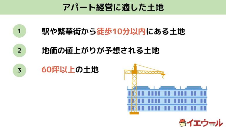 アパート経営に適した土地の特徴として、以下の3つの条件が挙げられます。