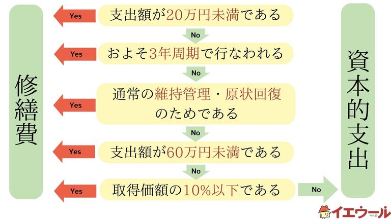 資本的支出と修繕費の正確な分け方としては、工事の内容によって税務上で基準が設けられています。ただし、屋上の防水工事やフローリングの張替えなど、判断が難しいものもあるでしょう。そういった際は、以下のチャートを参考にしてください。