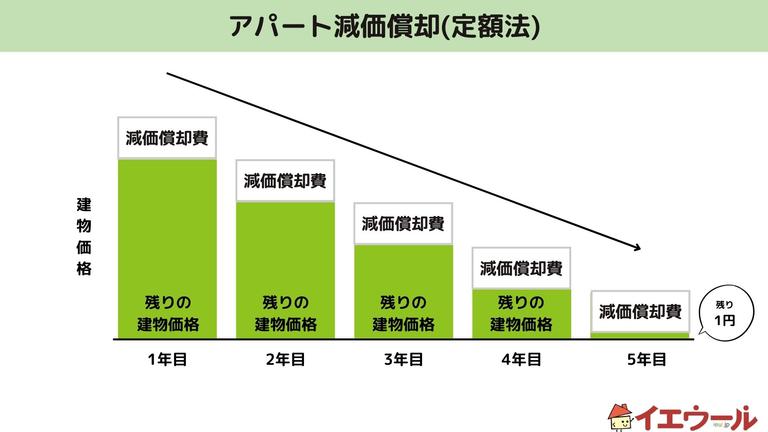 定額法とは、アパートの購入・建築価格を耐用年数の期間中で均等に割り、毎年同じ金額で減価償却を行う計算方法のことです。建物に関するものは基本的に「定額法」で計算されます。