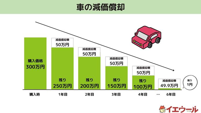 例えば、300万円の普通自動車を買ったとします。車は、使用年数が経過するほど徐々に価値が減り、最後には資産としての価値がなくなります。