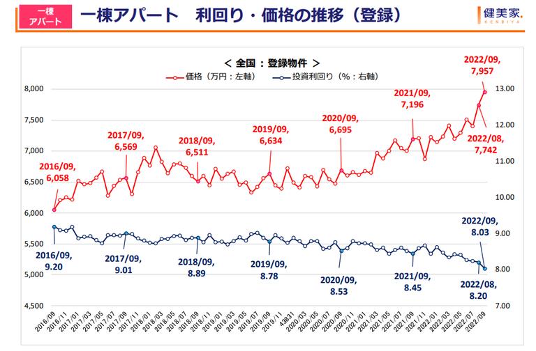 下のグラフは「不動産投資と収益物件の情報サイト 健美家( けんびや ) 」による『収益物件 市場動向マンスリーレポート 2022年9月期』であり、一棟アパートの表面利回りと価格の推移を表しています。