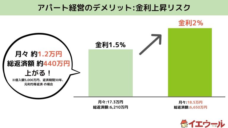 多くの場合でローンを組んでアパート経営を始めますが、金利の上昇によって最終的な支払い額が増加する可能性があるというデメリットがあります。