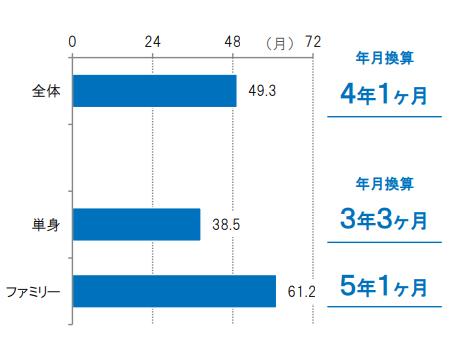 全国の平均居住期間は全体で約4年になります。単身の場合は約3年、ファミリーの場合は約5年になります。この結果から入居さえしてもらえば、約4年間は安定した家賃収入が見込めることになります。