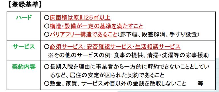 国道交通省によると、サ高住の登録基準の主な要件は下表のようになっています。