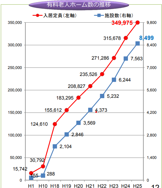 図のように、介護事業は成長市場であることも相まって、有料老人ホームの数は年々増加している傾向にあります。