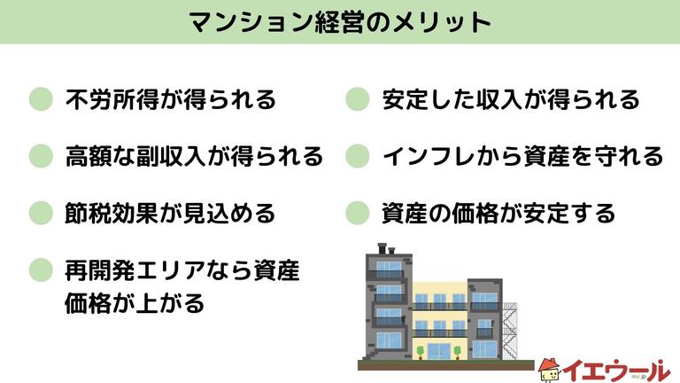 マンション経営は不動産投資の一種であるため、当然リスクはあります。しかし、メリットも豊富で、成功すると長期間安定した収入が得られることは大きな魅力です。