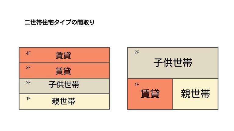 2階建ての自宅兼アパートで自宅部分を広くとる場合、自宅と賃貸をそれぞれ2階建てにする間取りか(縦割り)、それぞれを1フロアで使う間取り(横割り)のどちらかになります。