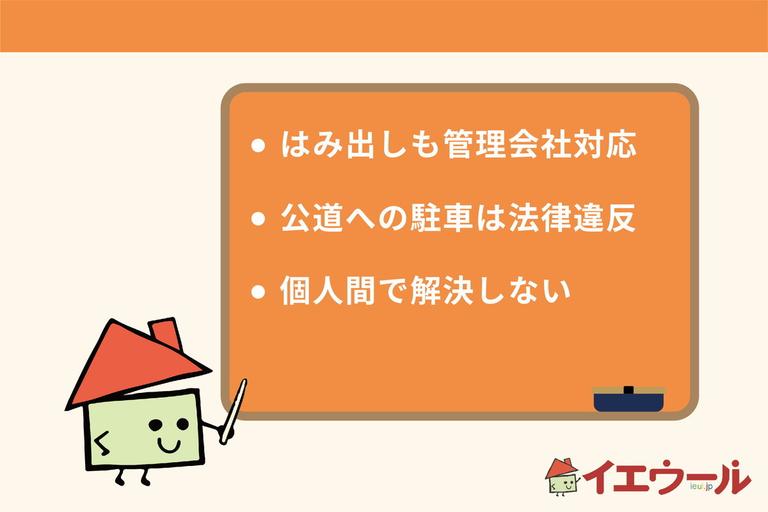 無断駐車のケースと同様に、「はみ出し」に対しても、まずは管理会社に連絡を入れることが原則です。オーナーが直接対応してしまうと、結局は個人間でのトラブルになってしまい、最終的には「言った、言わない」のすれ違いになりかねません。個人間での言い争いを、いくら続けても生産性はありませんので、「はみ出し」に限らず、敷地内で起きたトラブルに関しては、基本的にすべて管理会社に連絡を入れたほうが無難です。
