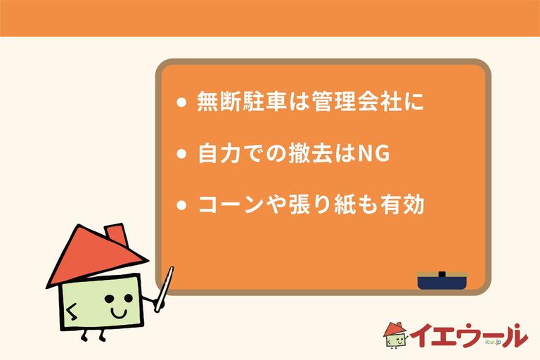 悪質な無断駐車に対し、オーナーとして講じることができる対策にも限界があります。大切なのは、個人での対策に多額の費用をかけるより、できる限り建設的で安全な方法をとることです。最も簡単で法的な根拠もある対策としては、管理会社へ連絡してその後の管理を委託することです。管理会社を介入させることによって、個人間でのトラブルを避けることができ、一つひとつの対策に法的拘束力を持たせることにもつながります。