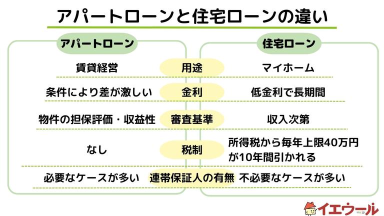 アパートローンと住宅ローンは利用できる人の条件や資金の使い道、金利などに違いがあります。例えば住宅ローンは、本人や家族が暮らすためのマイホームとして購入する時に使えるローンであり、アパート経営をするときに住宅ローンの融資を受けることはできません。