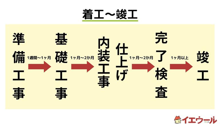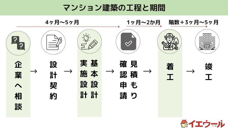 また、下記の画像はマンションの着工~竣工の流れと期間を示しています。