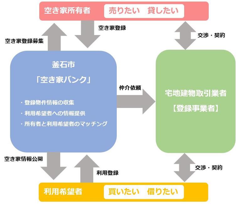 主に地方自治体が空き家の登録を募り、Web上で物件情報を公開して買い手や借り手を探すというマッチングサービスです。以下では岩手県釜石市の空き家バンクの仕組みを例に、制度の仕組みを図解でご紹介します。
