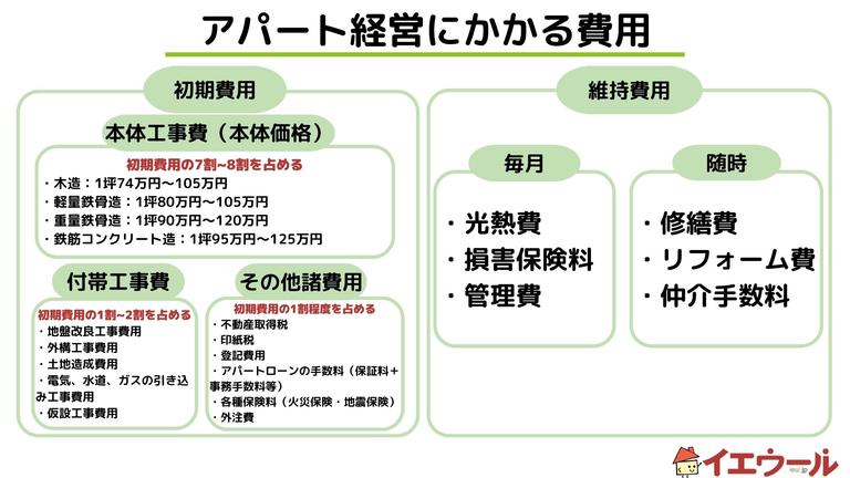以下の画像はアパート経営にかかる費用についてまとめたものです。