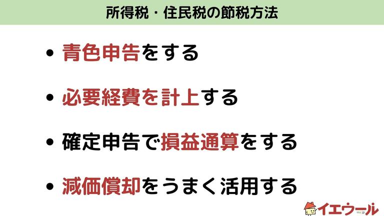 もう少し具体的に解説すると、所得税では損益通算をすることで節税が可能になり、相続税では課税評価額が現金よりも低くなることから節税が可能になります。