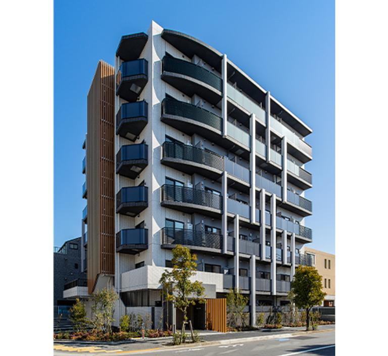 ダイナミックなフォルムが目を引く5階建の自宅併用マンション。重厚なキラテックタイルの外観と洗練された外構計画がマッチして、分譲高級マンショングレードの上質感を演出しています。予約制で自由に使える共用のルーフバルコニーは、毎週末予約で埋まるほど入居者に大人気です。