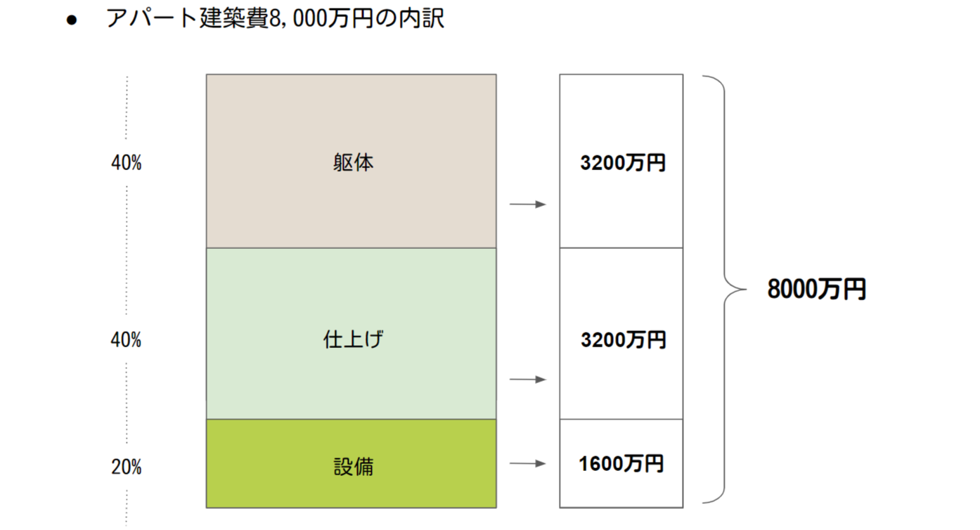 また、アパートの本体価格は、躯体工事費が40%、仕上げ工事費が40%、設備工事費が20%とされています。