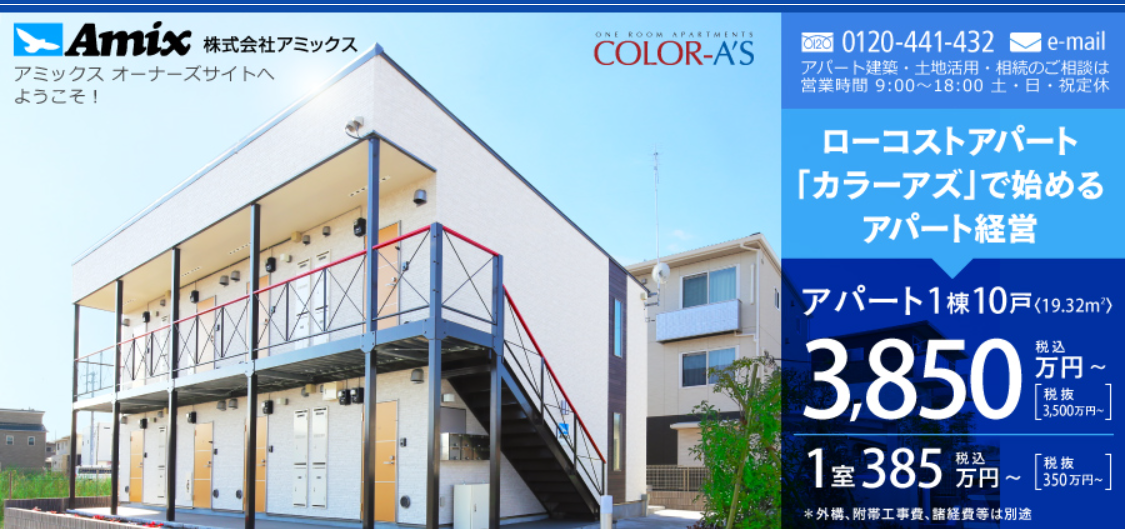 株式会社アミックスは、オーナー様が安定した賃貸経営をするために、初期投資を抑えたローコストアパート「カラーアズ」を提供しています。