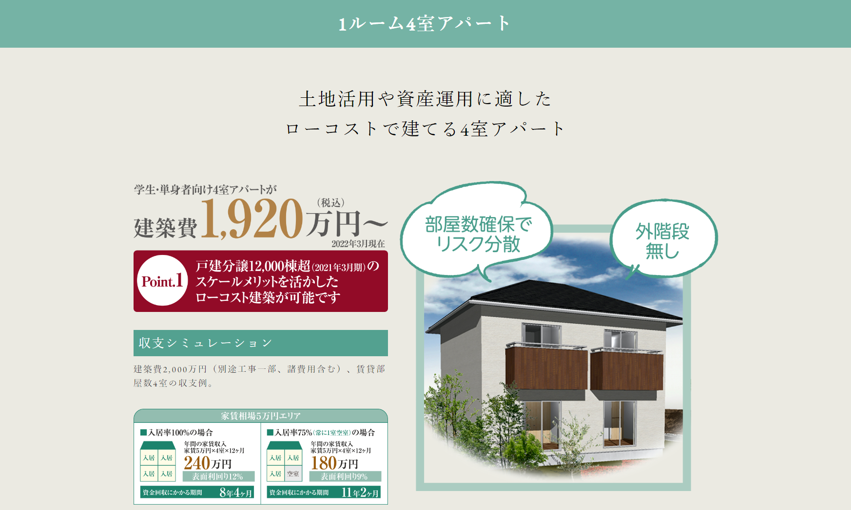 株式会社アーネストワンは、土地活用や資産運用に適した学生・単身者向け4室アパートを1,920万円から提供しています。
