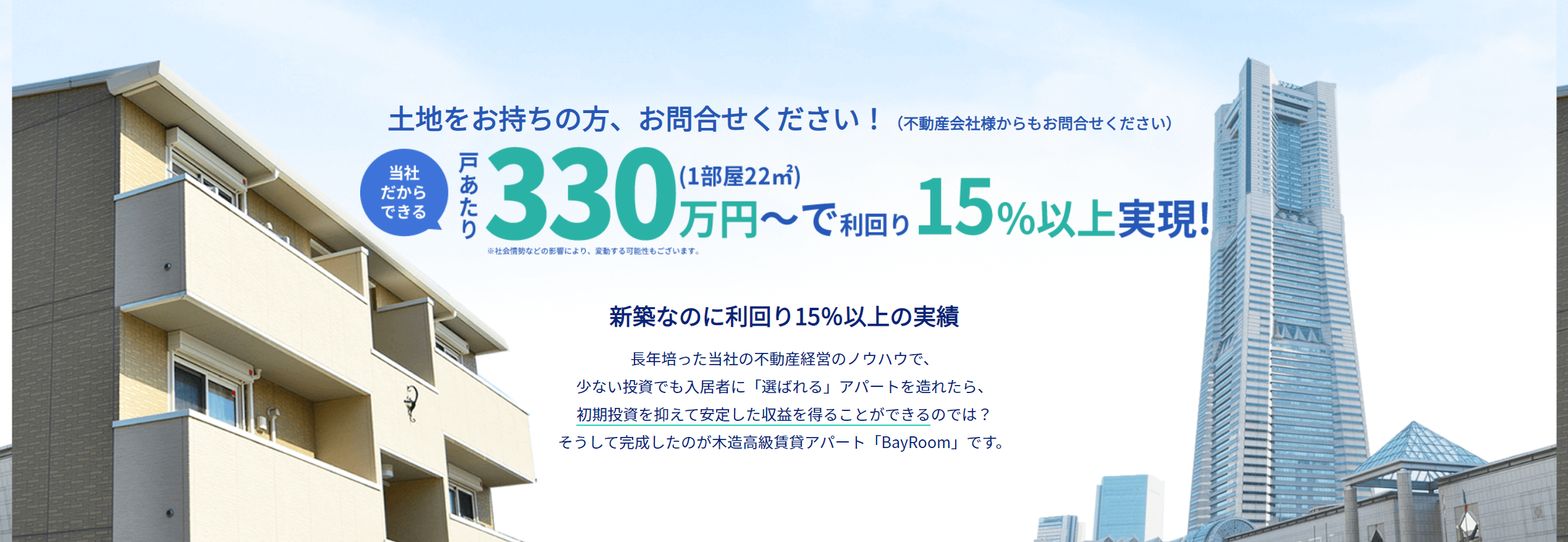 横濱コーポレーション株式会社は、初期投資を抑えて安定した収益を得ることができる木造高級賃貸アパート「BayRoom」を提供しています。