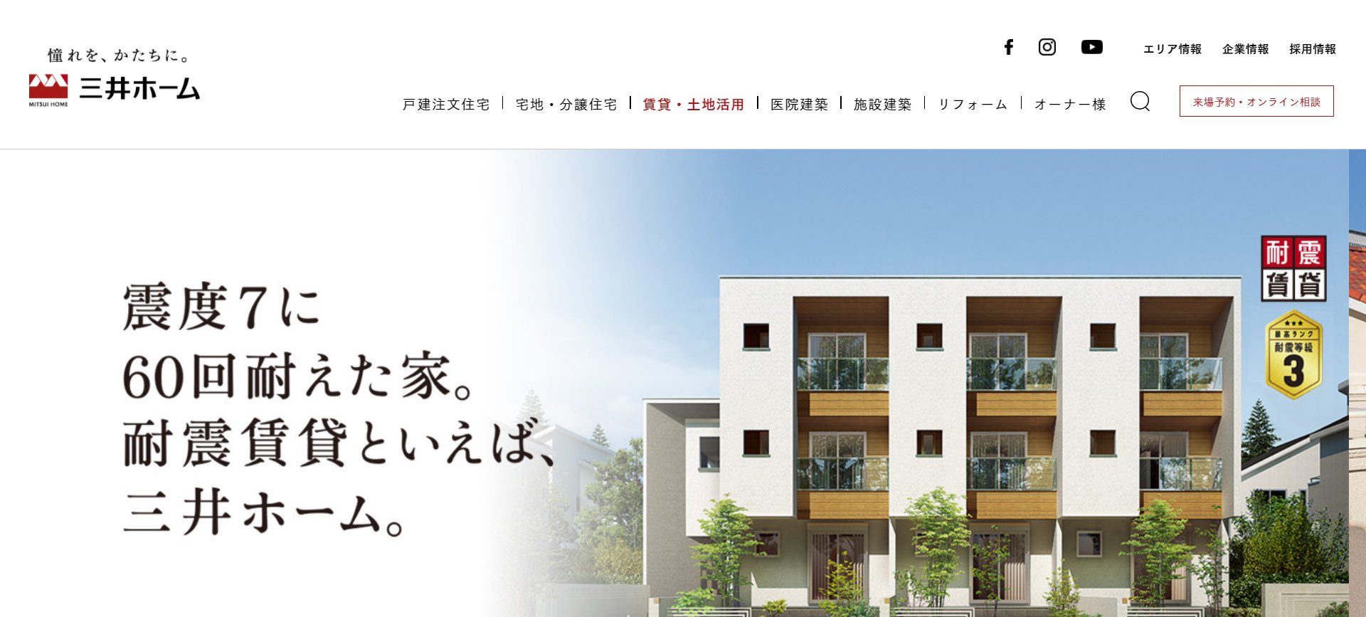 日本の環境に特化し、入居者の安全性を考え抜いて三井ホーム独自の技術を基に開発した「プレミアム・モノコック構法」によって非常に耐久性のあるアパート建築が可能となっています。