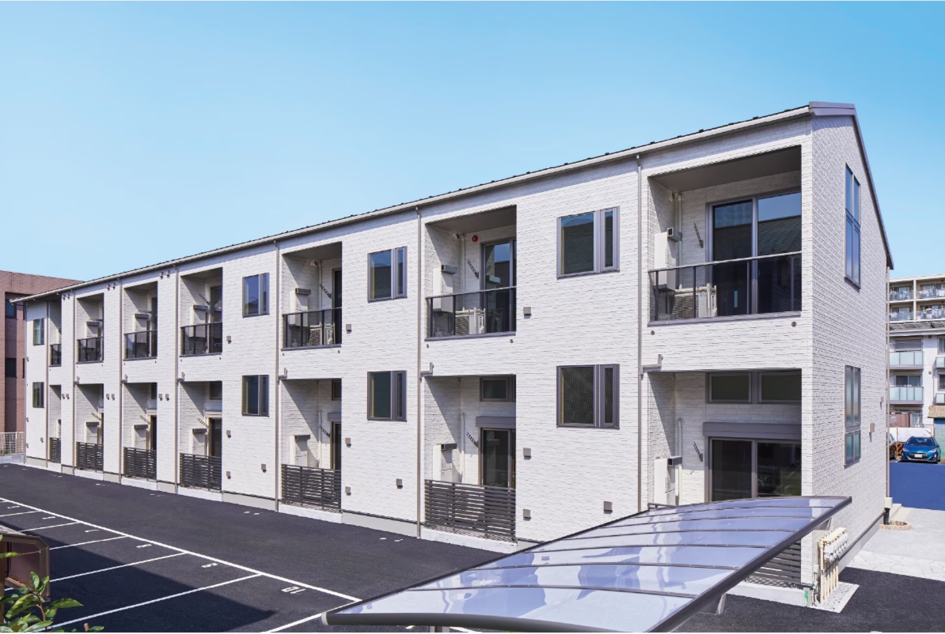オーナー様のご希望で、落ち着いた雰囲気にこだわり、残した園芸用地は入居者の借景になるように配慮。敷地内にはポケットパークや、バーベキューテラスを設けるなど、入居者が楽しく過ごせる住宅が完成しました。