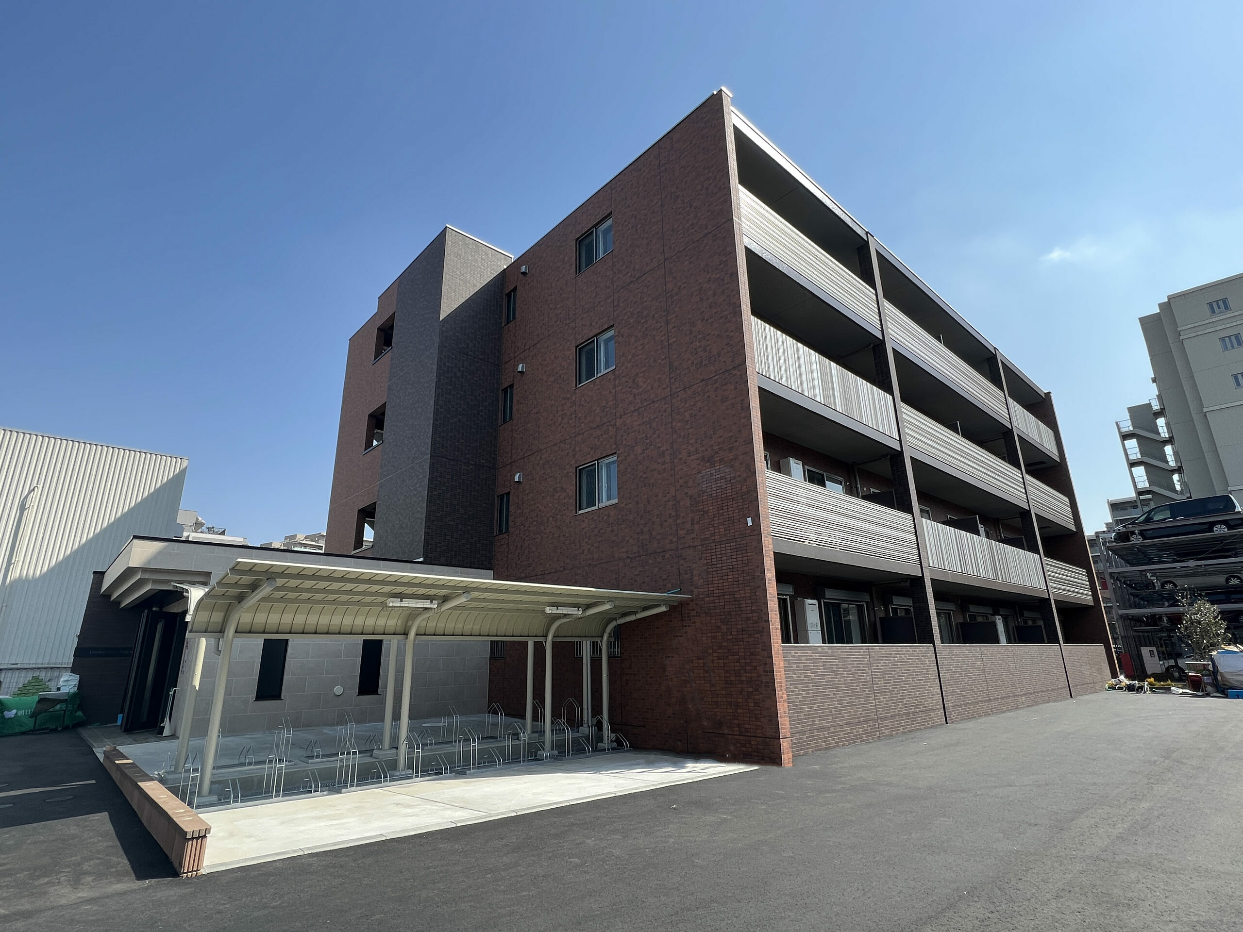 また、最近ではカラスや夏場になるとムクドリが襲来してアパートの目の前のゴミを漁ってしまうことが多かったので、ボックス型のゴミ箱を置くようにしました。 他にも、南に入居者の駐車場を置くことで日当たりの良い間取りを実現することを設計前に意識をしました。