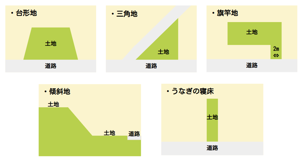 以上のような三角形や台形、極端に細長い形、旗のような形をした「不整形地」では始められる活用方法が限られてきます。