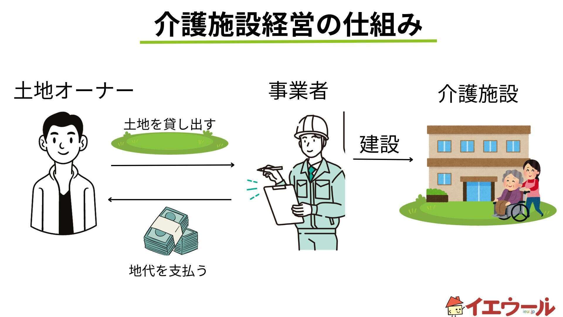 介護事業者とは、通常事業用定期借地として賃借契約します。事業用定期借地というのは、事業用の建物を建設する場合にのみ貸す契約をした土地のことです。土地の所有者が建物を建てる必要はなく、年間の収入も得ることができます。