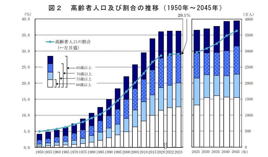 また、国立社会保障・人口問題研究所の推計によると、この割合は今後も上昇を続け、2045年には日本の総人口における高齢者の割合が36.3%になると見込まれています。