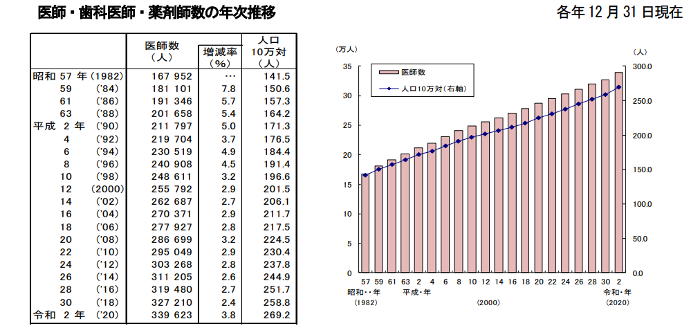 厚生労働省の調査によると、日本の医師数は2002年から2020年の間に、26万2687人から33万9623人となり、7万6936人増加しています。今後さらに増加が見込まれます。