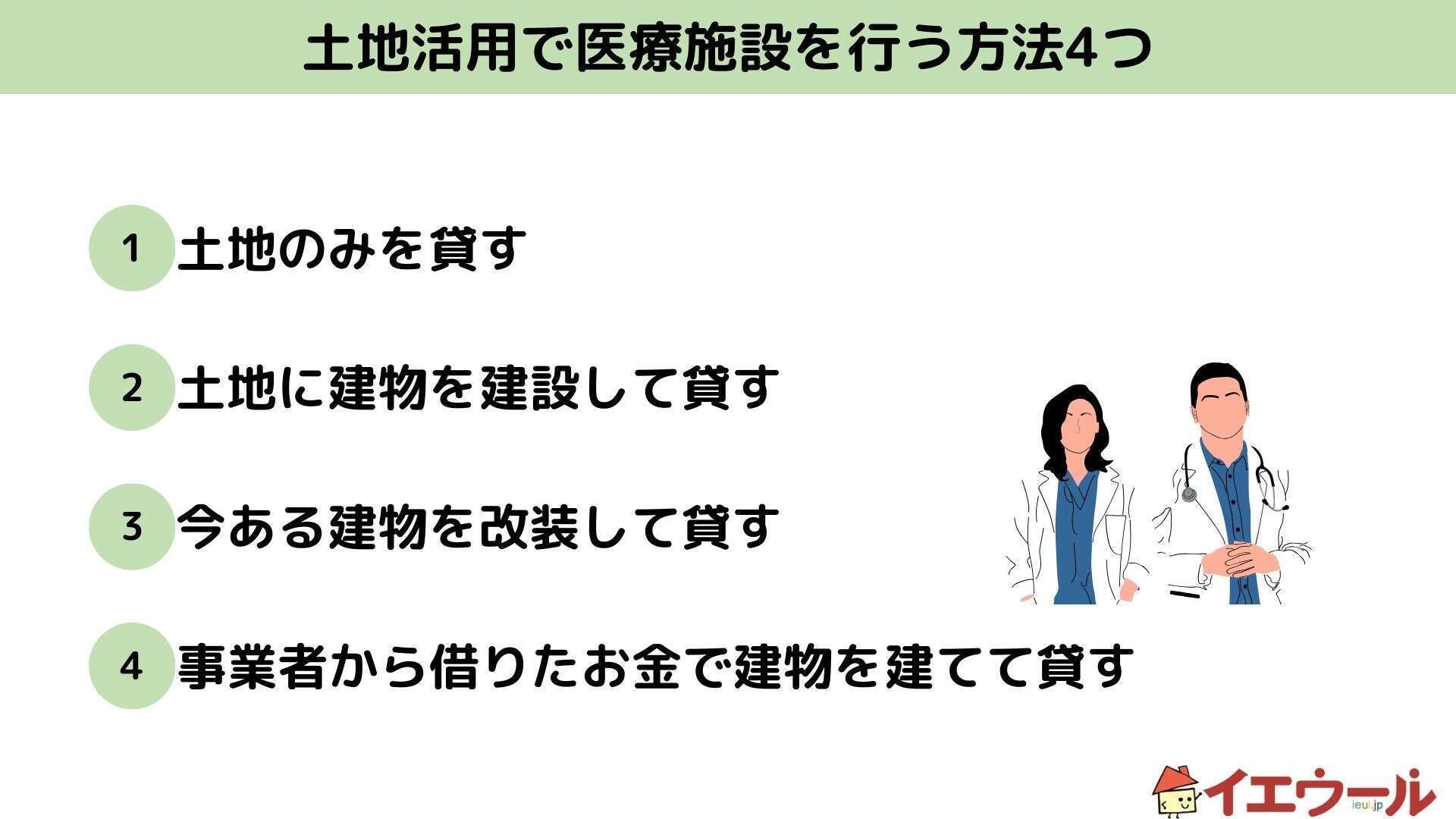 土地活用で医療施設を行う方法は「土地のみを貸す」「自分で土地に建物を建設して貸す」「今ある建物を改装して貸す」「事業者から借りたお金で建物を建てて貸す」の4つです。