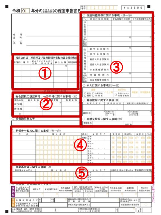 ⑤事業専従者に関する事項:家族を専従者として給与を支払っている場合、氏名、マイナンバー、給与額などを記入。