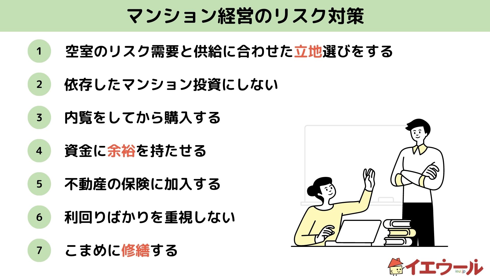 こうした問題発生による損失はもちろん、その対応の責任を負うリスクも、マンション経営で起こり得ることは覚えておきましょう。