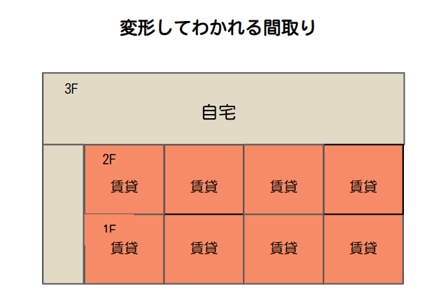 こちらの間取りの基本は横割りとなっていますが、1階と2階の賃貸部分はそれぞれが階段でつながった物件となっています。そのため、3階が自宅部分、1階・2階の賃貸部分が4戸という配置です。